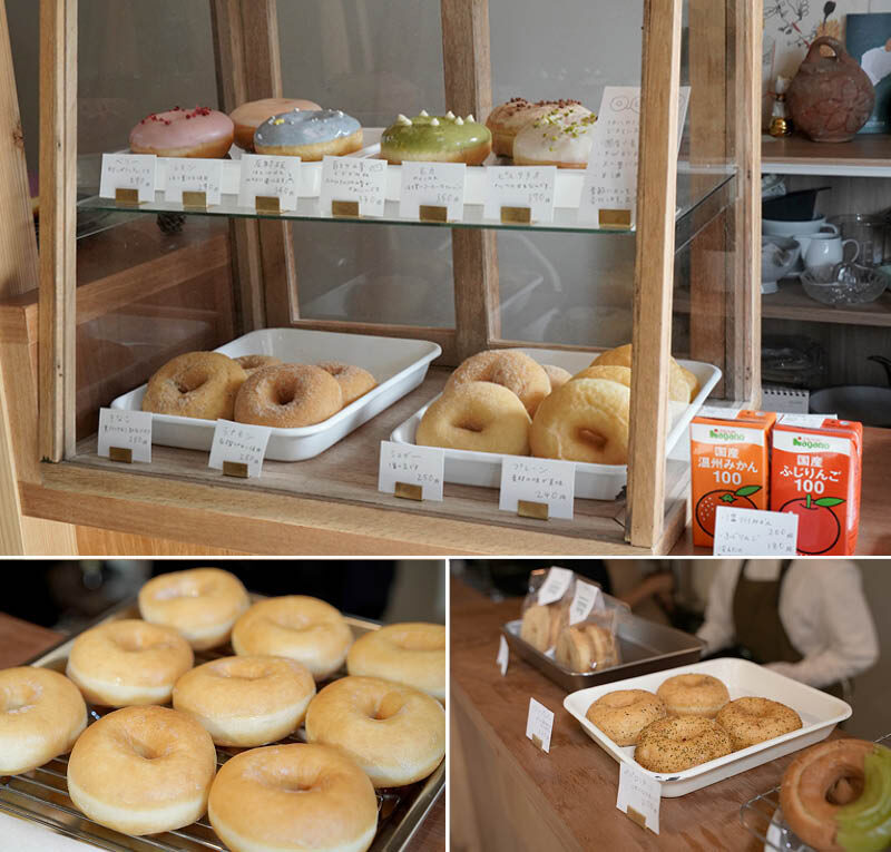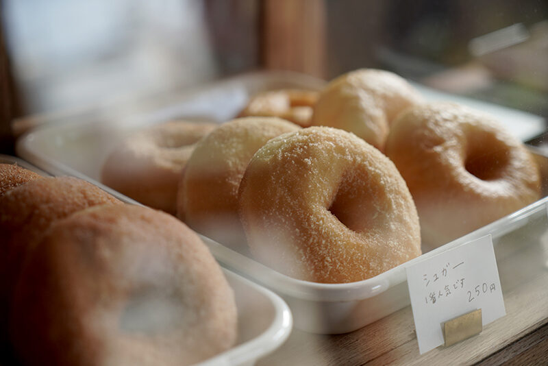 店頭に並ぶドーナツの愛称は、「どどドーナツ」。定番から季節限定のフレーバーまで種類豊富にそろいます。そのどれもが国産小麦や米粉、きび砂糖、米油など体にやさしい素材で、一つ一つ丁寧に手作りされています。