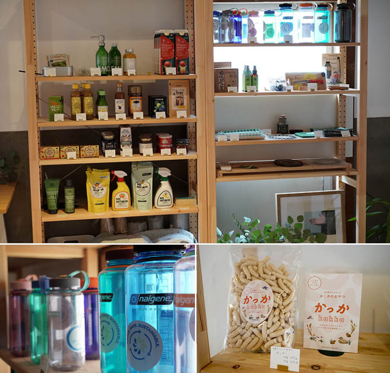 店の一角には、物販コーナーがあります。置いてあるのは、水筒やナイフといった山の道具のほか、有機玄米のお菓子や自然素材の洗浄剤なども。これらの自然と心地よく暮らすためのアイテムは、池田さんが実際に使って良いと感じたものがセレクトされています。