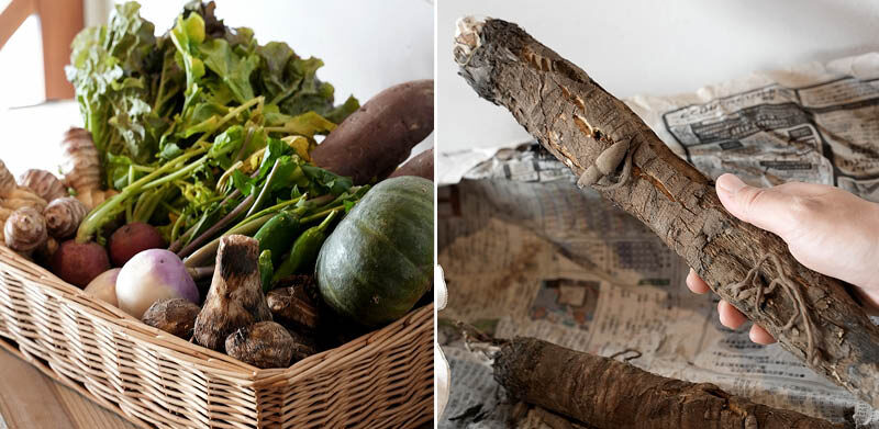 店で使う野菜は海津市の岡田農園や岐阜市のTANAKA FAMILY FARMから仕入れる無農薬栽培のもの。泥つきで形も不ぞろいですが、それこそが自然に育った証し。ごぼうはまるで木の幹のように生命力にあふれています。「味が濃くしっかりしているので、素材だけでも十分おいしいんです」と理奈さん。