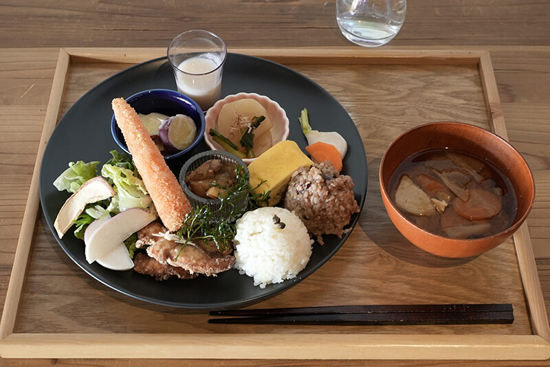 この日は、サバの竜田揚げをメインに、菊芋のきんぴらやさつまいもの煮物、かぶのさっと煮が並びます。こんもりと盛られたご飯は発酵玄米と七分づきの2種類。玄米は発酵させることで、もちもちとした食感になるだけでなく、ストレス緩和や高血圧予防など、心や体にうれしい働きもあるのだそう♪