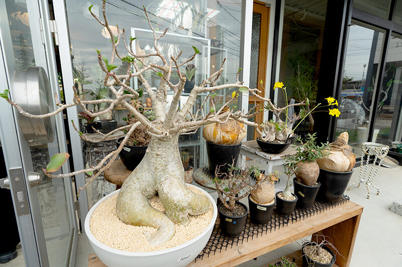 塊根植物にはパキポディウムやアデニウムをはじめ、アデニアやユーフォルビアなどさまざまな種類があり、それぞれに多くの品種が存在します。「しかも、同じ品種でも幹の膨らみ方や葉の出方は一つ一つ違う。一株として同じものがないところが面白いですね」と健志さん。