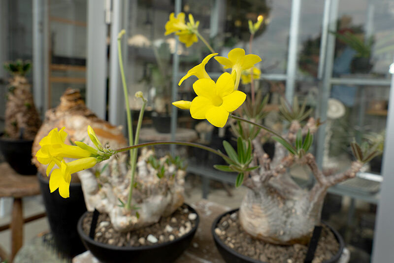 無骨な見た目の塊根植物ですが、春から夏にかけて色鮮やかな花をつけることもあります。「この姿からは想像もできないような、かわいらしい花が咲くのが本当に不思議でしょうがない。生きているんだなあって見惚れてしまうんです」と麻里さんは目を細めます。