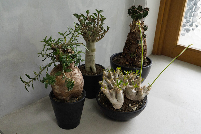 写真手前中央のパキポディウム・ブレビカリックスはマダガスカル、左のパキポディウム・ビスピノーサムと奥のユーフォルビア・ムランジーナはアフリカ南部で生まれ育った“現地球”と呼ばれる個体。ゴツゴツとした野性味あふれる姿が印象的です。「遠い国で育った植物が、こうして手元にあるってロマンがありますよね。そんな出合いも魅力の一つだと思います」。